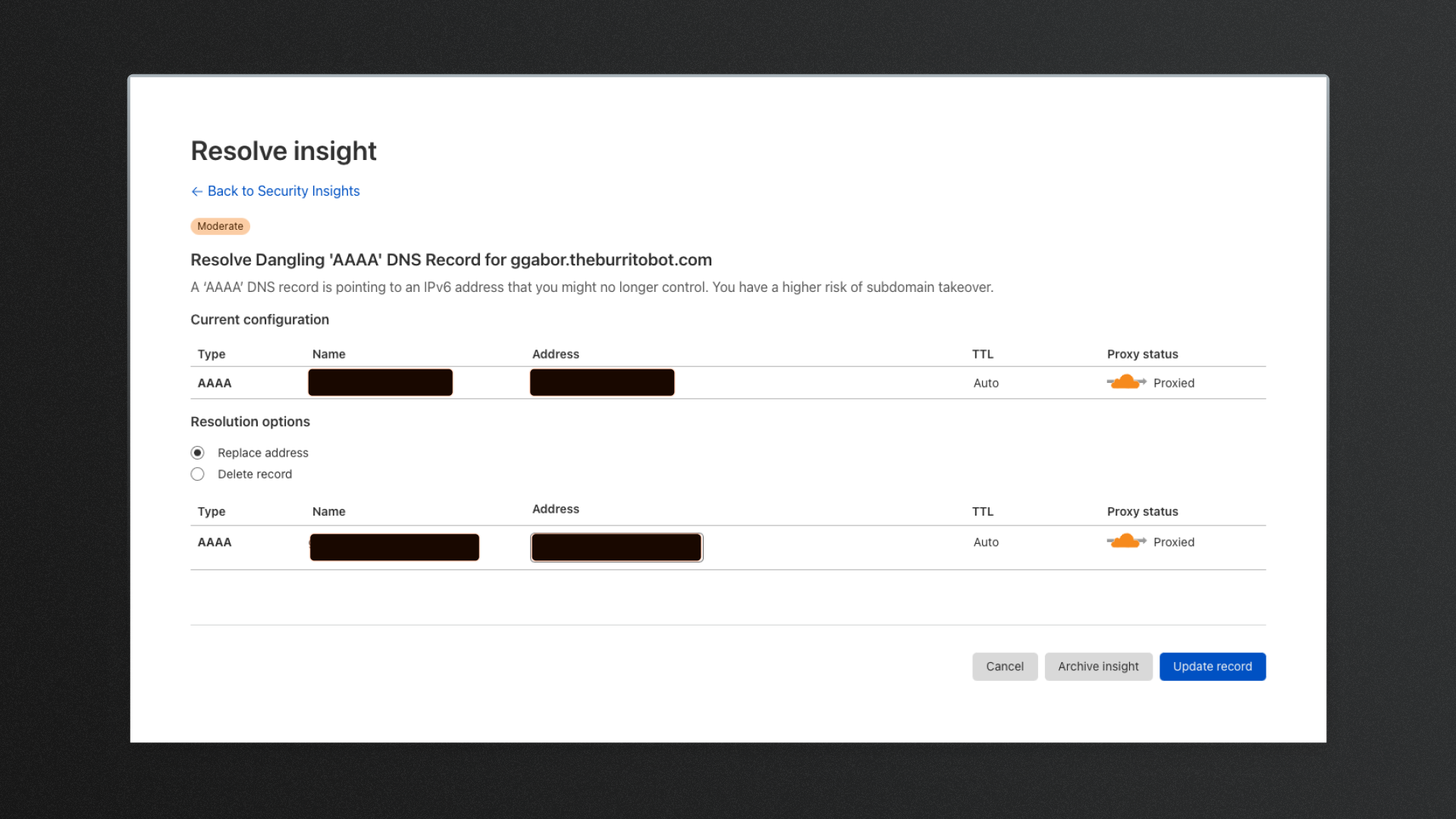 Some users were not familiar navigating through the Cloudflare Dashboard and they wanted a straightforward way of mitigating the risk. Making what's complex, simple, has always been a goal of when whatever feature I'm designing. Where possible, we included a single click, resolution workflow. Here, users would be able to read a summary of the risk and either take action on it, or archive the issue. Alternatively, if we wouldn't manage the issue from this page, we would help the user navigate to the correct page within the dashboard.